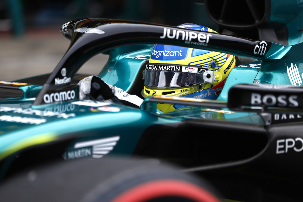 Fernando Alonso, Aston Martin AMR23, leaves the garage