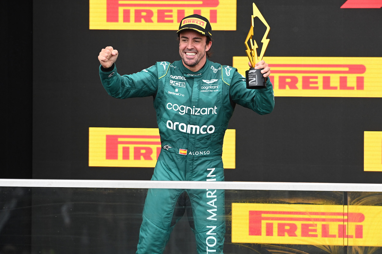 Fernando Alonso, Aston Martin F1 Team, 2nd position, celebrates on the podium with his trophy