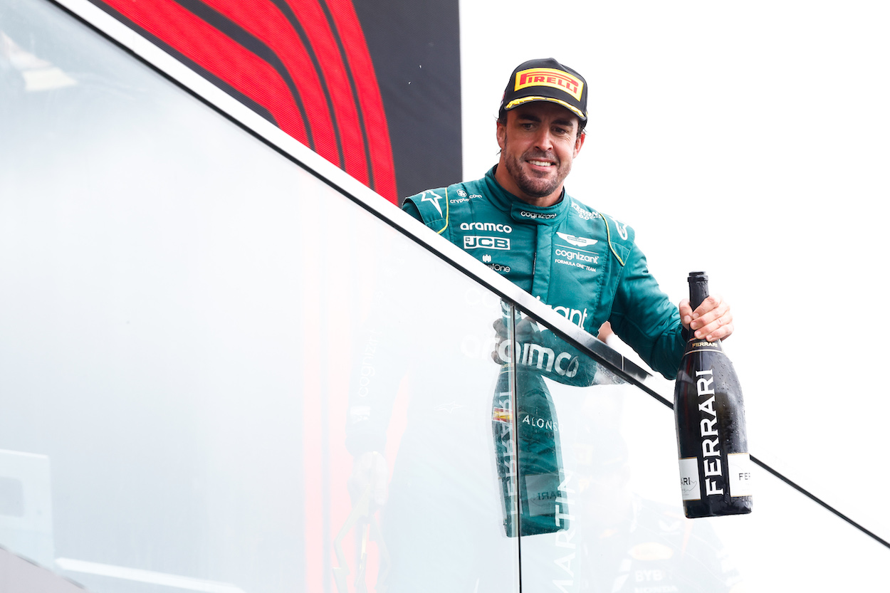 Fernando Alonso, Aston Martin F1 Team, 2nd position, passes his Champagne bottle down from the podium
