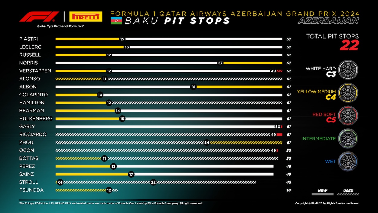 As widely predicted, all the drivers opted for two stops, although there were several permutations. For example, the top two finishers opted to go Medium/Hard/Medium, while Perez started on Hard before twice fitting Mediums. Four drivers started on Softs: Sainz, Gasly, Stroll and Tsunoda. Making the best use of the extra grip afforded by the C5 was Ferrari’s Spanish driver, who crossed the line sixth at the end of the opening lap, having started eleventh. AlphaTauri’s Japanese driver used all three available compounds, while in the Williams, Alex Albon did the most consecutive laps (38) on Hard tyres. Sainz drove the longest stint on Softs (15 laps), while Ricciardo did no fewer than 40 laps on one set of Mediums. The most used compound was the C3 (770 laps, 61.5%), followed by the C4 (448, 35.78%) and the C5 (34, 2.72%).