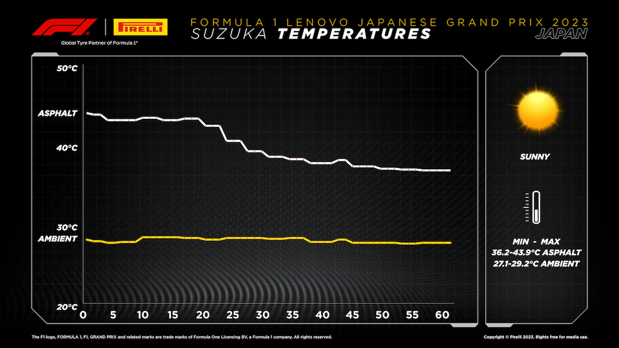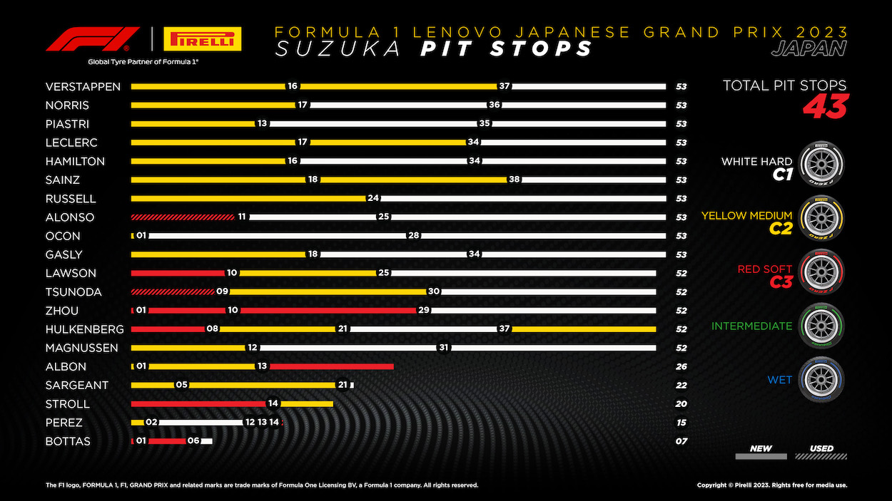 The Suzuka track is one of the toughest on tyres, and this year, we saw higher temperatures than usual, increasing their demands. This afternoon, everything went as we had expected, and all three available compounds were used, thus creating a situation where we saw several different strategies between the teams and drivers. After studying the data from free practice, we reckoned that a two-stop plan was the quickest, and that was confirmed. Those who tried something different, Russell, for example, had to give their best in the closing stages to their two-stopping rivals. Compared to Friday, we saw that the Medium was the most used, even if the difference in terms of degradation when compared to the Soft, also today, was not that big. The C2 offered greater flexibility in terms of management, and that’s why the majority of drivers opted to start with it.