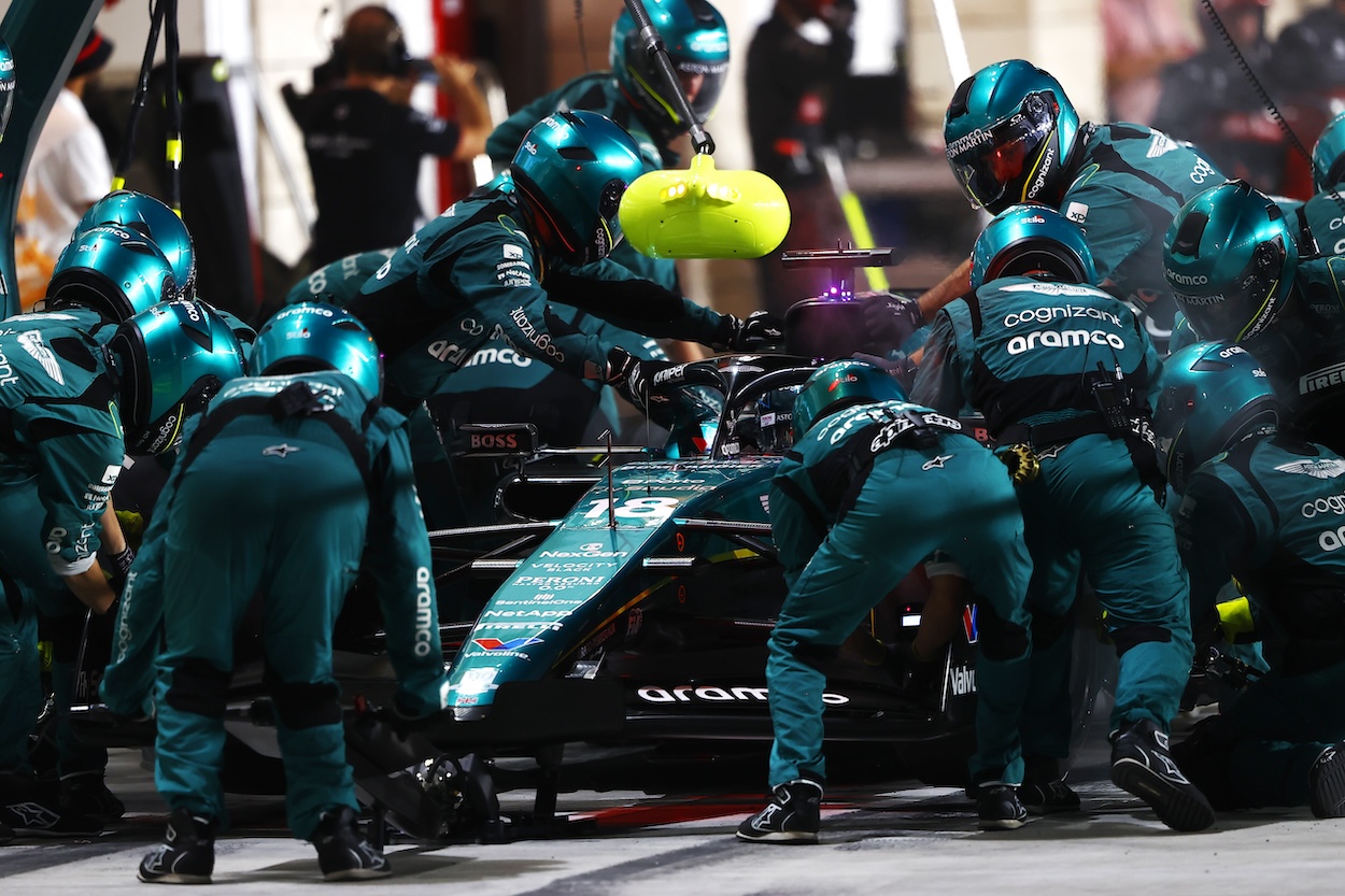 Lance Stroll, Aston Martin AMR23, makes a stop