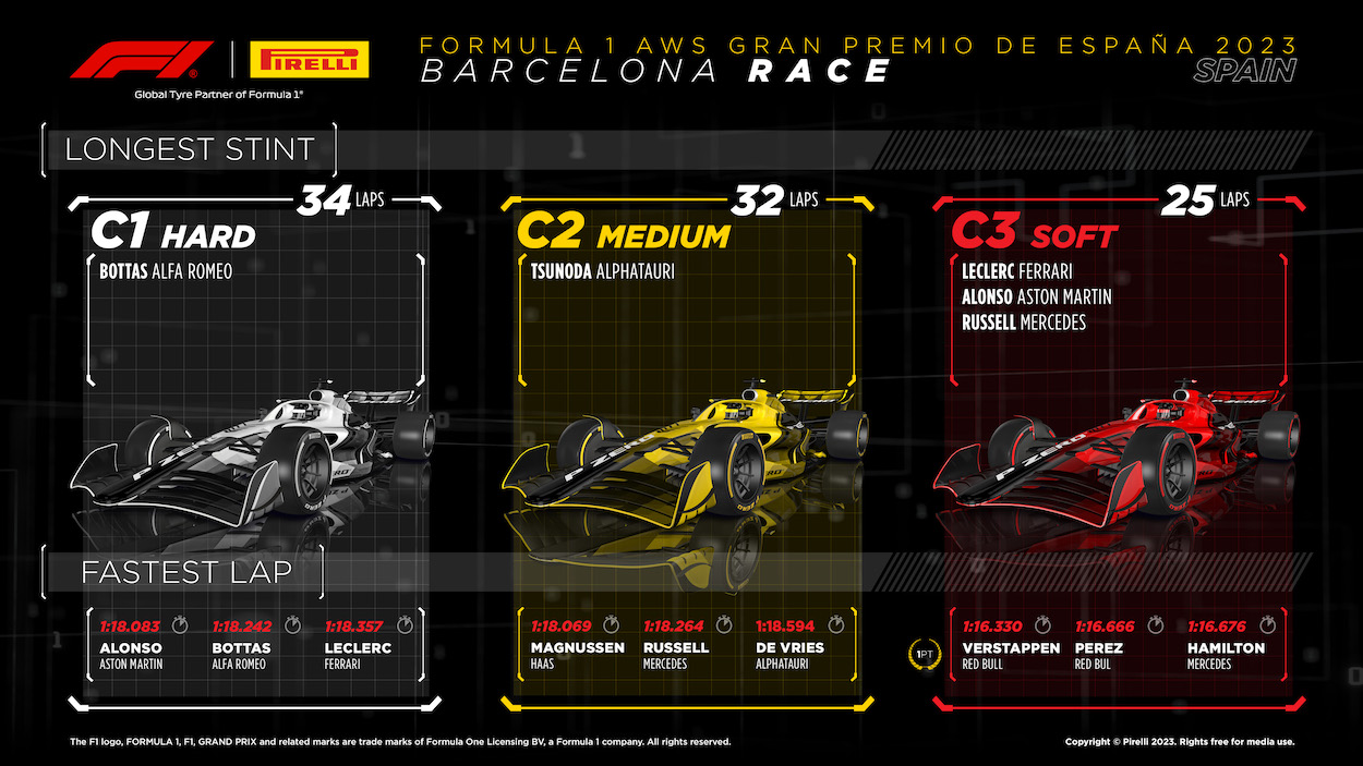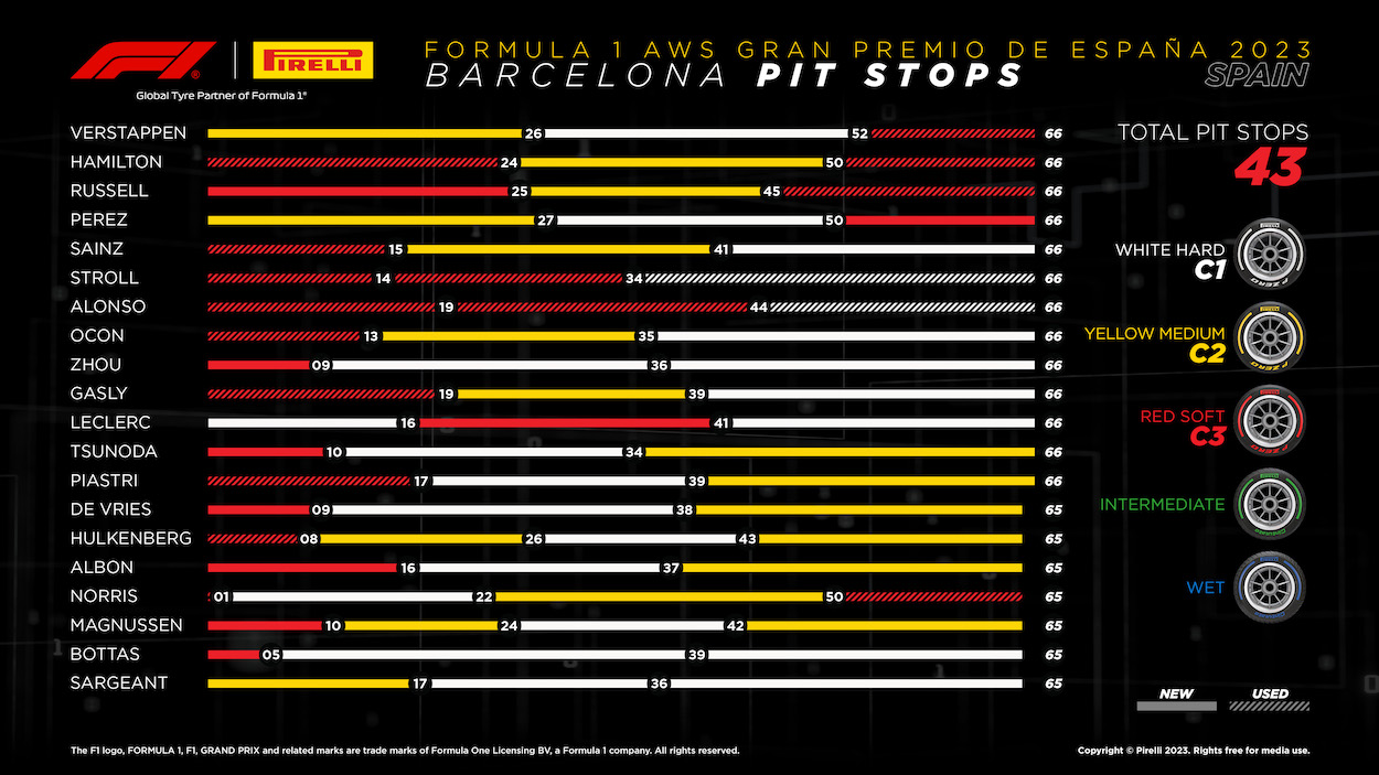 It took a lot of work to predict strategies for the Spanish Grand Prix, partly due to the low level of degradation on the compounds and the chance of rain arriving, although that was ruled out after a few laps. The first four all took the chequered flag on Softs. The Red Bull pair went from Medium to Hard (Verstappen after 26 laps, Perez 23), while Mercedes opted for the Medium in the middle stint. Aston Martin went for Softs for the first two stints, doing the last on the hardest compound. Others to finish on the Hard tyre were the Ferrari, Alpine and Alfa Romeo drivers and Logan Sargeant (Williams).