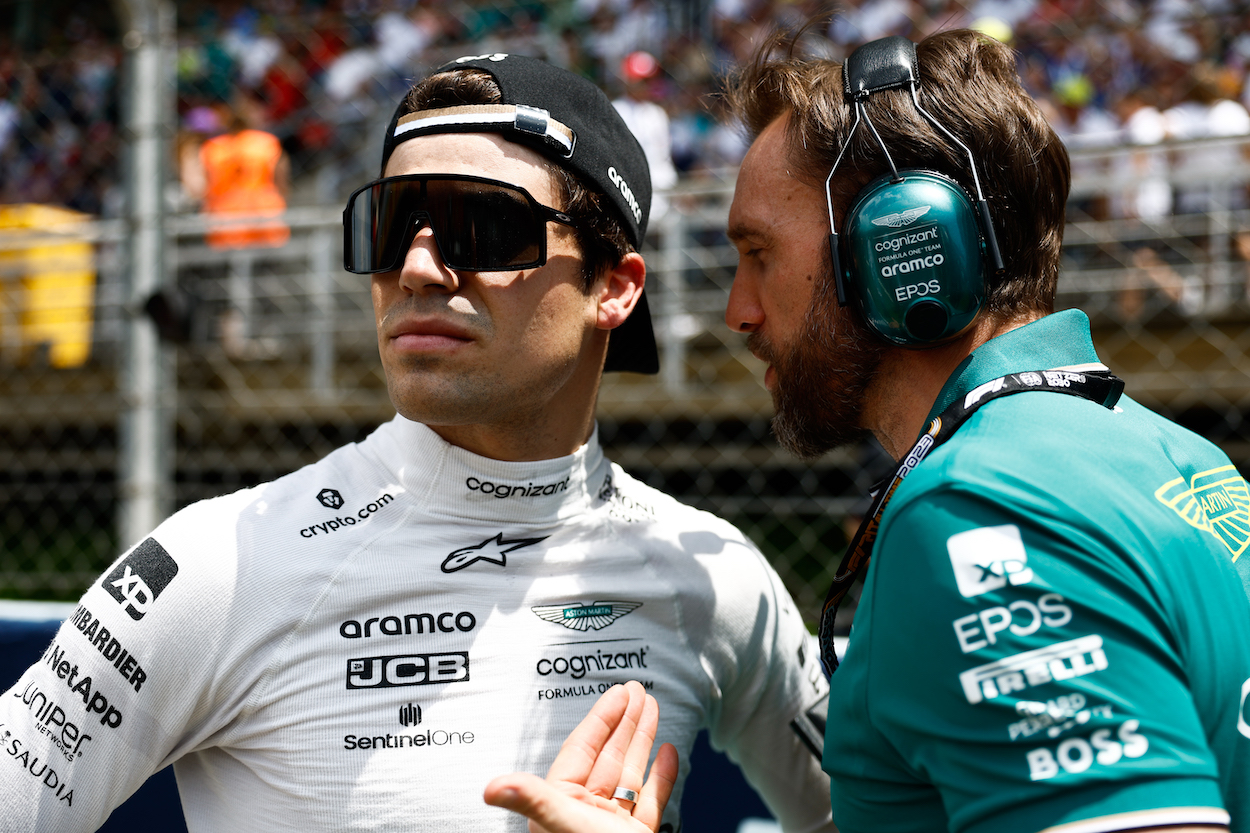 Lance Stroll, Aston Martin F1 Team, on the grid with an engineer