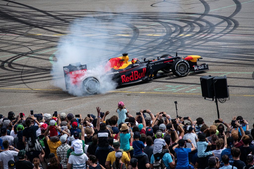 Topping the list of attractions were local hero Sébastien Buemi and the double-title winning RB8. The last time Séb brought an RB8 to Switzerland it was to tackle the tight and twisting Tremola Pass, a feat that required precision and care. This time, however, the Swiss driver had the wide open spaces of an entire airfield at his disposal, and with no boundaries in place, Sébastien gave the RB8 a proper thrashing.